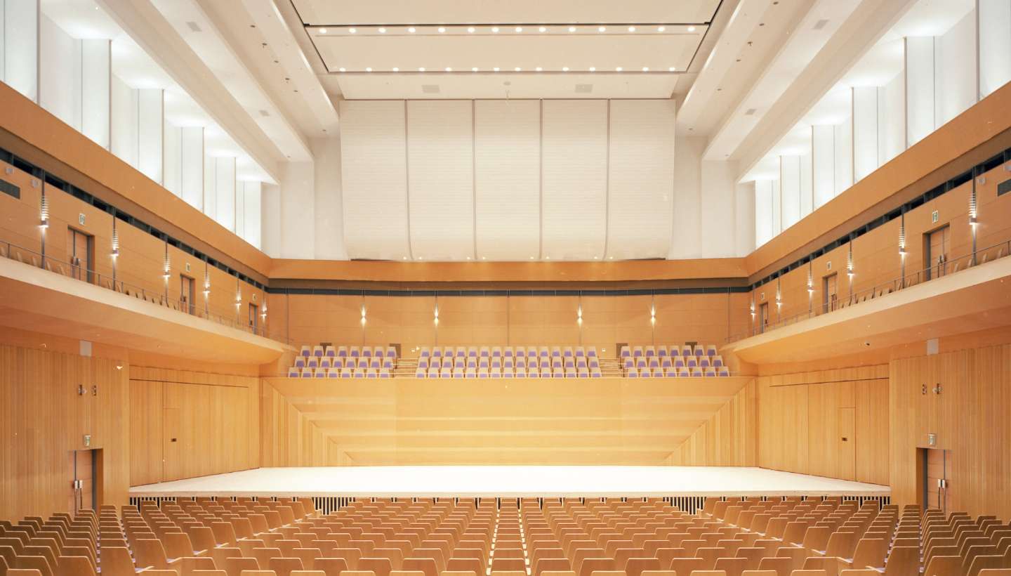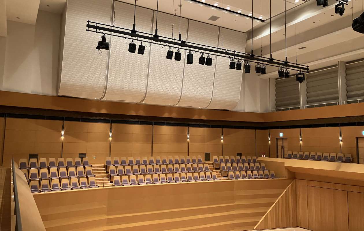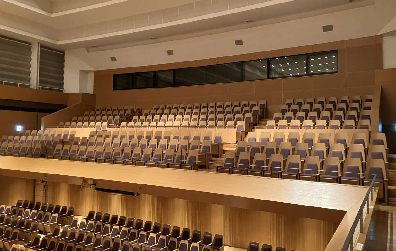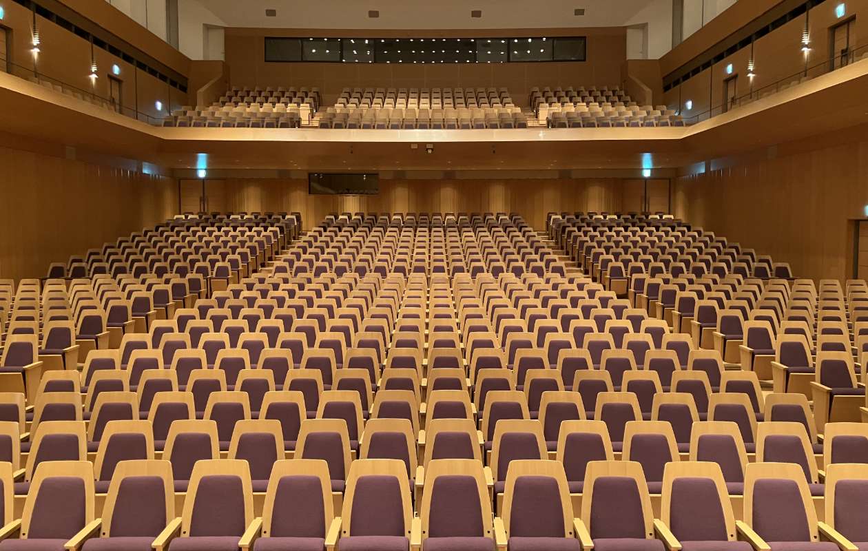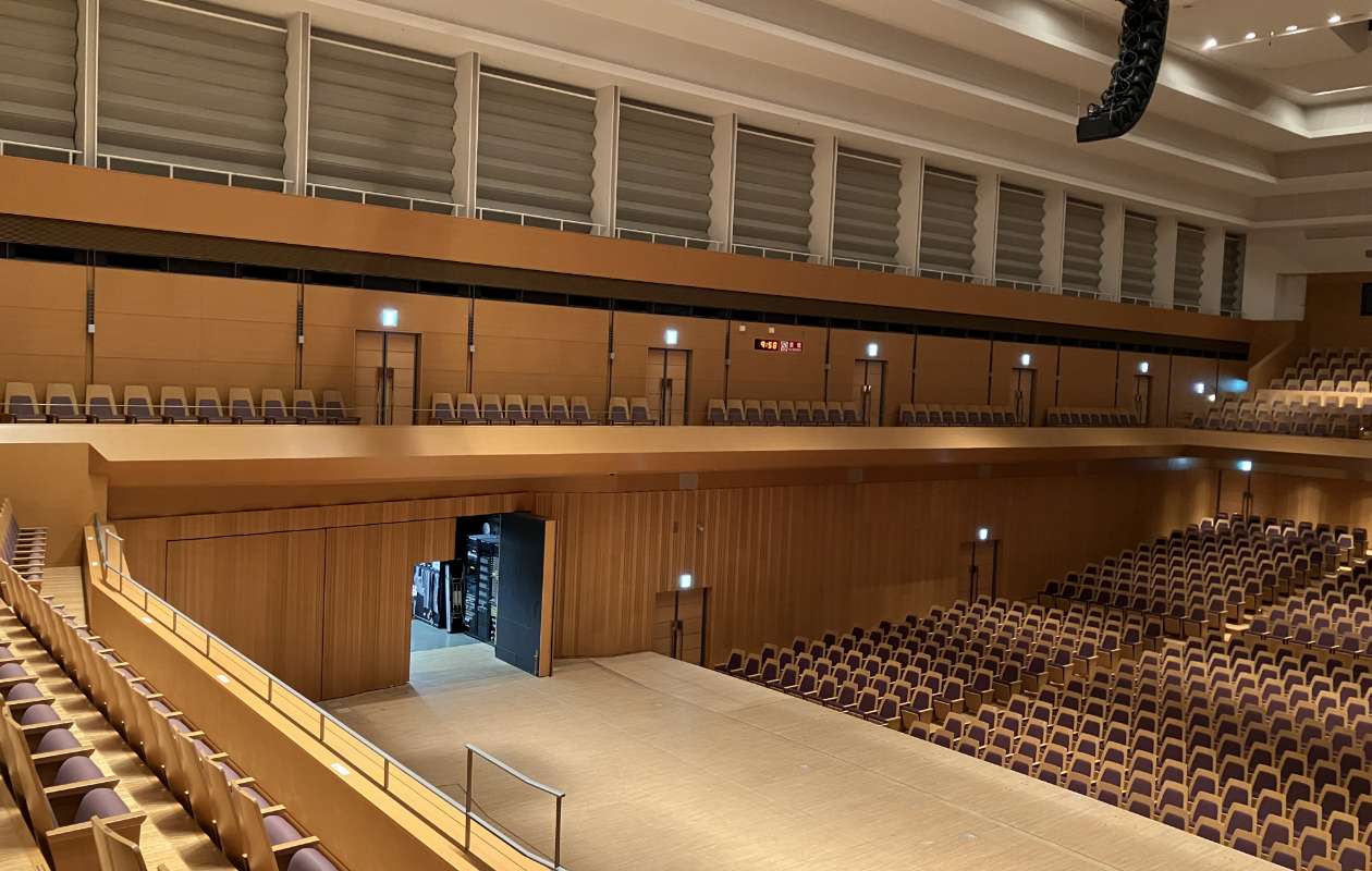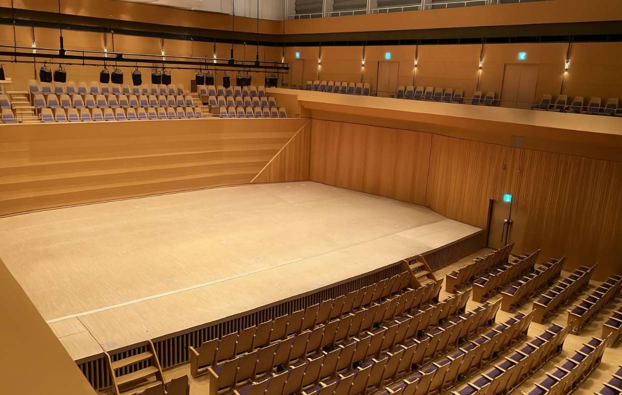 また、残響可変装置を使用することで、残響時間を調節(満席時で1.6~1.9秒)できます。舞台の広さ 幅19.7m×奥行9.98m×天井高14.7m