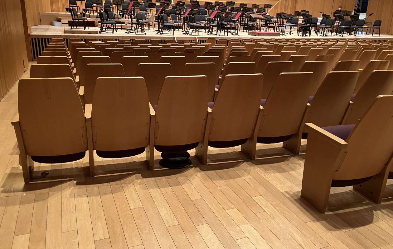 杉並公会堂大ホールの標準的な使用形態です。中編成(60人程度)のオーケストラ公演のほか、合唱やリサイタル・アンサンブル等、アコースティックな音楽利用に最適です。