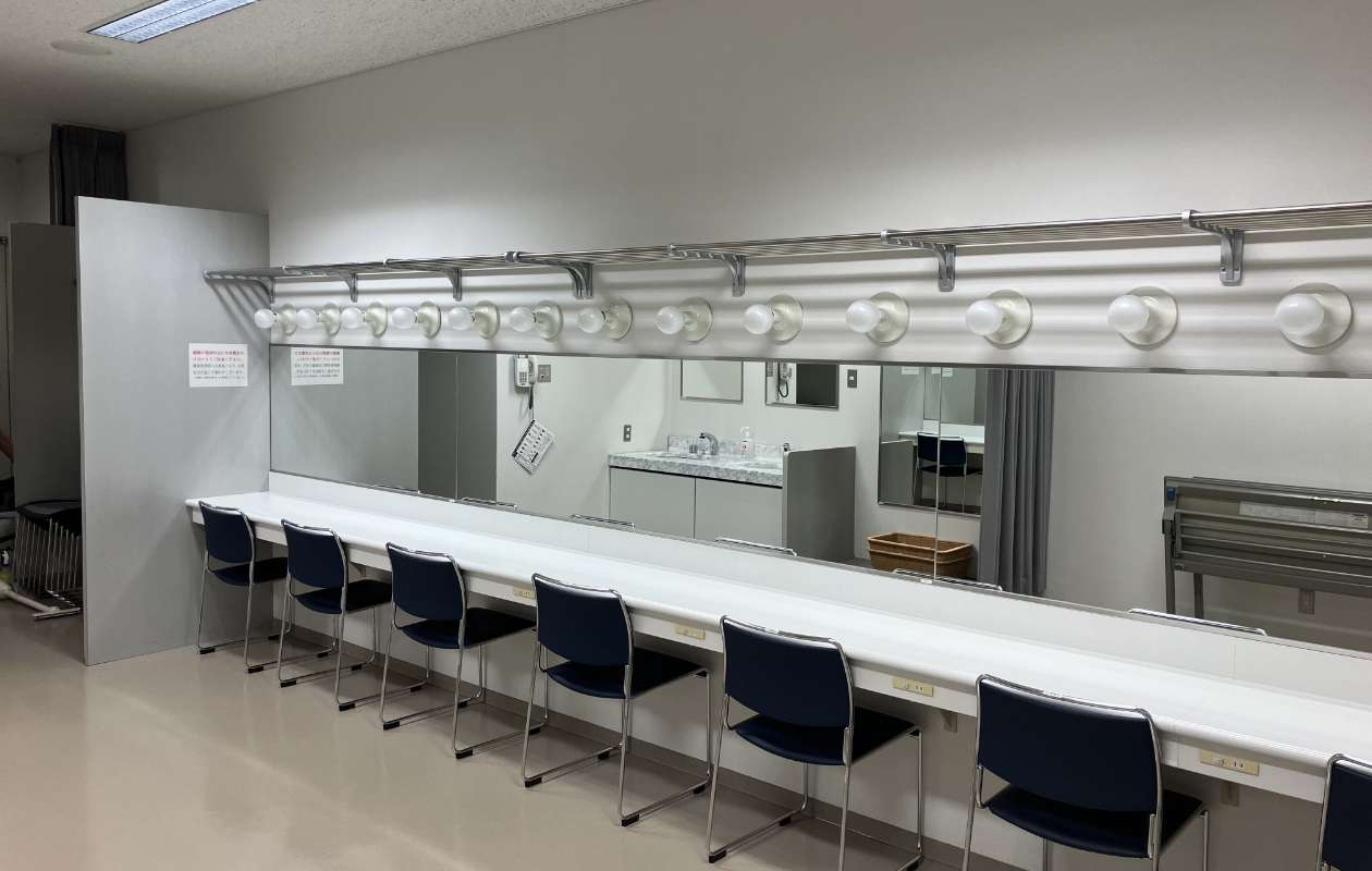 小楽屋が1部屋、大楽屋が2部屋、合計3部屋あります。(各楽屋に姿見、化粧台、舞台上が映るモニター、ハンガーラック1 台とハンガー数本があります。)